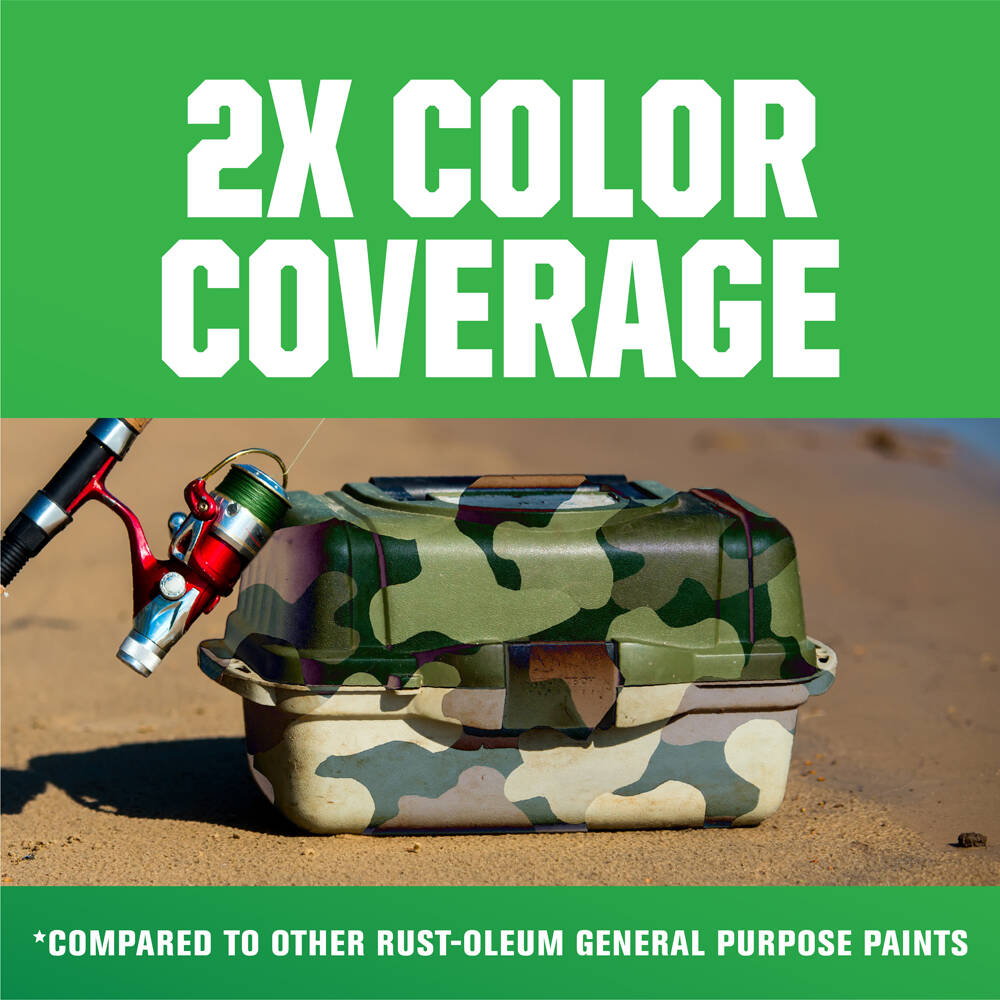 Rust-Oleum 2X Ultra Cover Camouflage Spray Paint provides a non-reflective, ultra flat finish for maximum hiding on interior or exterior surfaces. Fast drying camo spray paint offers quick transformation on surfaces, hunting gear, stencils and more.