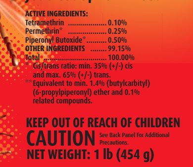 | Ingredients | Active: Tetramethrin 0.10%, Permethrin 0.25%, Piperonyl Butoxide 0.50%; Other: 99.15%; Total: 100.00% |