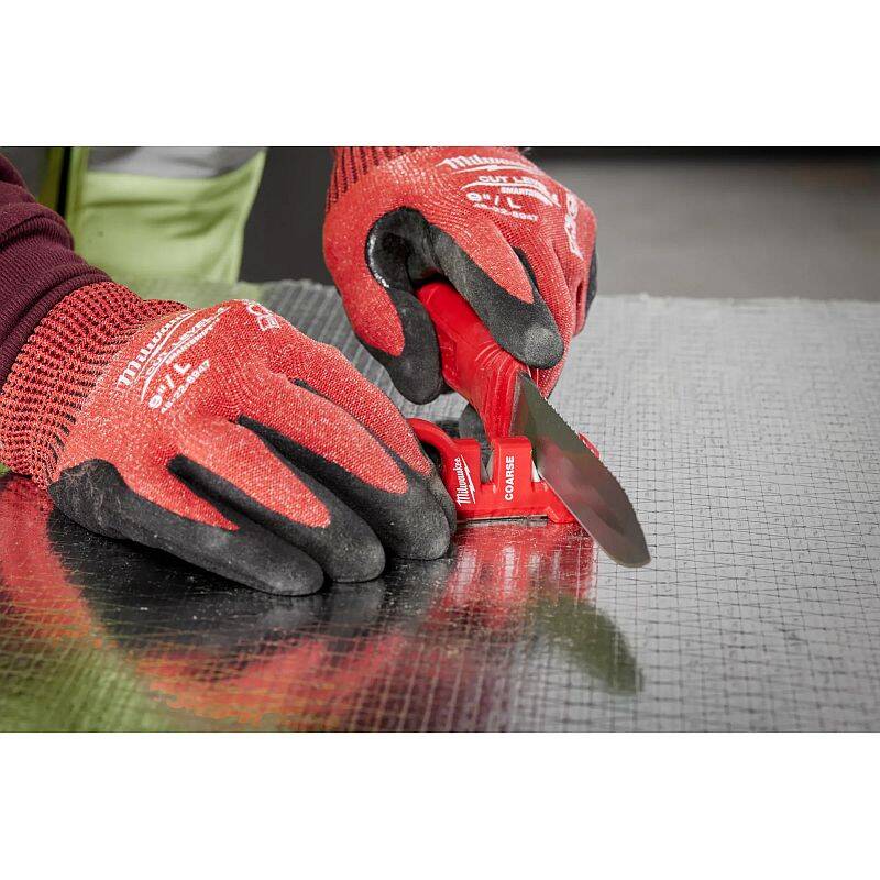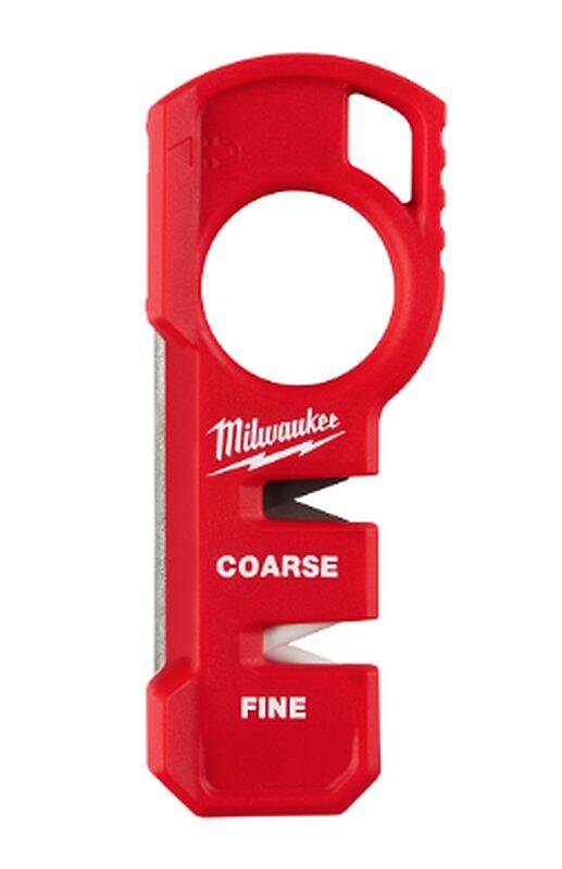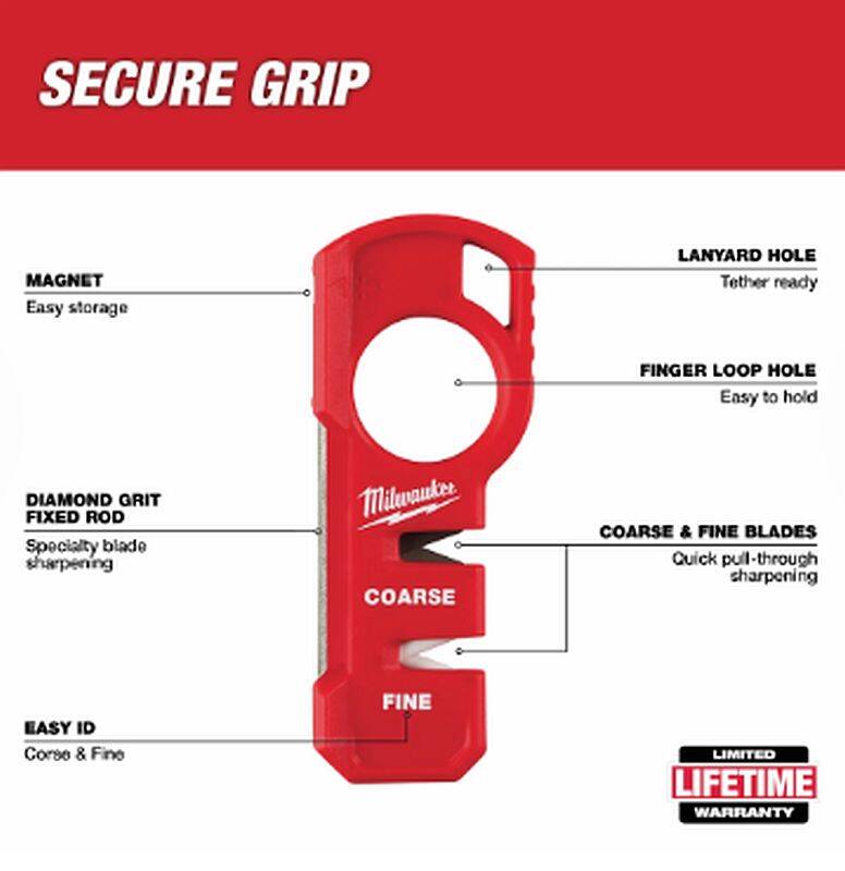 Our Compact Knife Sharpener has a large finger loop for a SECURE GRIP and added control while sharpening. This pull-through sharpener has three sharpening surfaces compatible with most knives; coarse carbide for quick edge setting, fine ceramic to finish the sharpened edge, and diamond grit for freestyle specialty blade sharpening. It's compact size is ideal for pocketed carry, and has a magnet for easy, convenient storage on the jobsite. This tool is also tether ready.