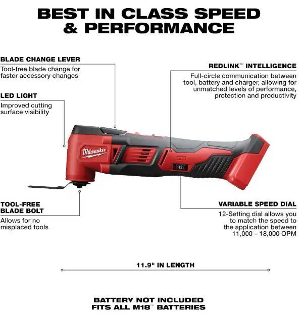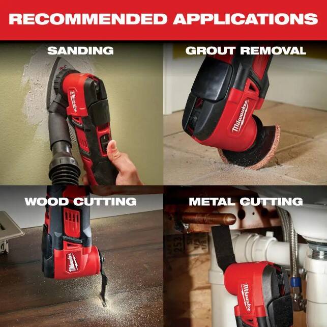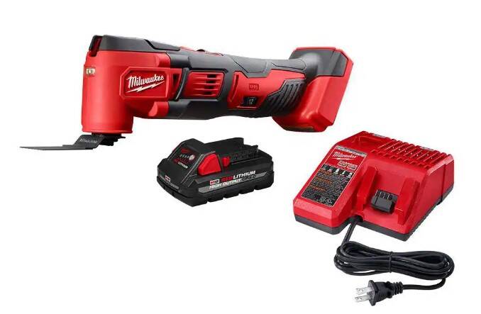 The Milwaukee® M18™ Cordless Multi-Tool Kit cuts up to 50% faster and delivers up to 2X more cuts per charge than the competitors. With best-in-class speed and performance, the cordless Multi-Tool offers the versatility to complete problematic jobsite applications. Ideal for remodelers, flooring contractors, maintenance repair technicians and electricians, the cordless Multi-Tool cuts, grinds, sands and scrapes at odd angles and in areas difficult to work. It’s powered by the M18™ REDLITHIUM Battery to deliver up to 40% more runtime. Use it to make flush or plunge cuts, remove grout, sand in corners and tackle other awkward jobs. The M18 Multi-Tool’s Constant Power Technology maintains blade speed for faster cutting during heavy applications. The 12-setting dial allows users to match the speed to the application. The kit includes an M12 XC High Capacity REDLITHIUM Battery Pack, an M18 & M12 Multi-Voltage Charger, 5 assorted sanding sheets, sanding pad, wood cutting blade and contractor bag.