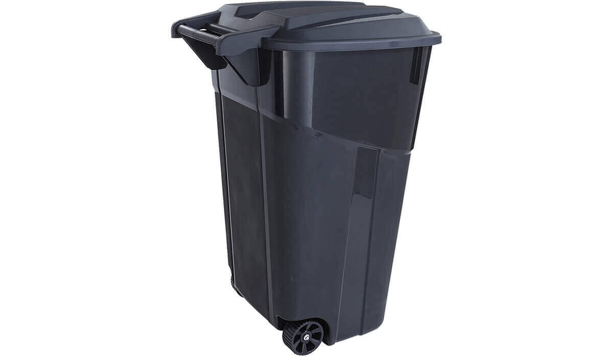 Attached, click lock, hinged lid; easy-grip handle; bottom hand groove; rugged wheels; easy clean material.