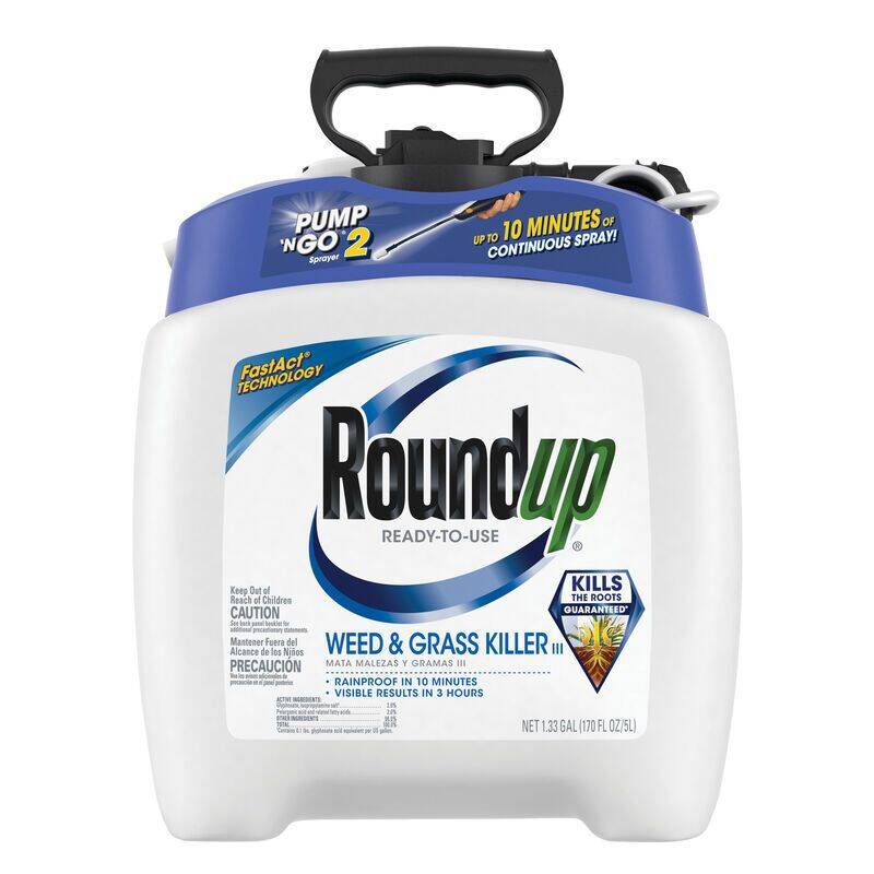 Kill the toughest weeds and grasses down to the root with Roundup® Ready-To-Use Weed & Grass Killer III with Pump ‘N Go® 2 Sprayer! The formula is ideal for use in and around vegetable gardens, flower beds, tree rings, and mulched beds, as well as on cracks in driveways, walkways, and patios. Plus the Pump N’ Go® Sprayer with an extendable wand provides 10 minutes of continuous spray to ensure that problem weeds and grass will stay away! This convenient, no-mix formula is rainproof in just 10 minutes - AND you get visible results in 3 hours. Kill weeds faster with Roundup®.