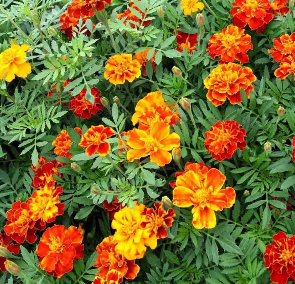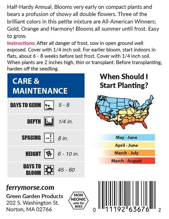 French Double Dwarf Mixed Colors Marigold blooms very early on compact plants and bears a profusion of showy double flowers; three brilliant colors in this petite mixture: gold, orange, and crimson.
