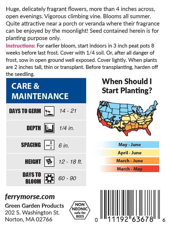 Huge, delicately fragrant flowers, more thanĀ four inches across, open during evenings and bloom all summer. Moonflower seeds offer a stunning display of bright and fragrant blooms all season long, providing months of beauty for your outdoor space.