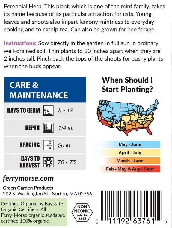 It can also be grown for bee forage. Young leaves and shoots impart a lemony-mint flavor to everyday cooking and catnip tea. Harvest catnip that's flavorful and sure to please your feline friends. It's easy to grow and maintain, with harvesting just 8?12 days away. Plus, enjoy the bonus of bee forage and natural kitchen flavorings.