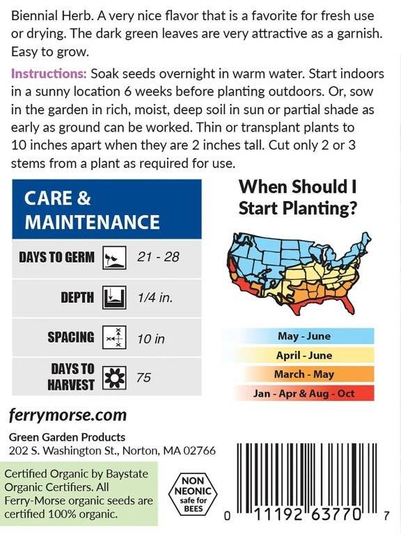 The herb plant's dark green leaves make a beautiful garnish. Easy to grow, soak seeds in warm water before sowing, and they should germinate in 21-28 days.