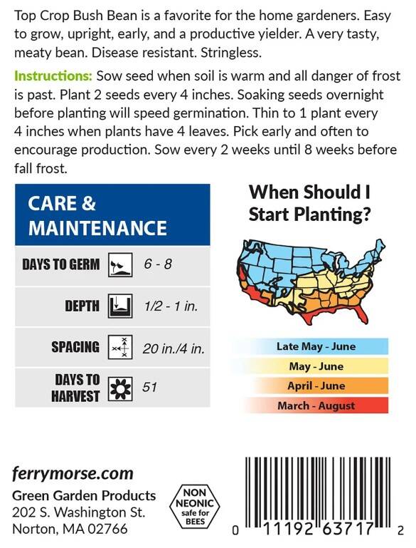 This old-fashioned favorite generates a wealth of pods that are easy to pick and stringless, meaning less work in the kitchen. Heirloom Top Crop Bush Bean Seeds offer an abundance of delicious beans for every meal.