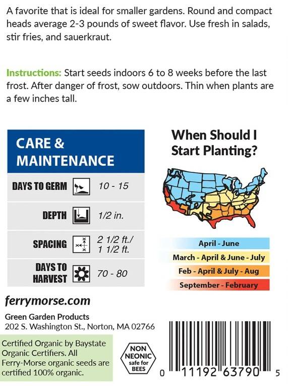 Our Early Golden Acre Cabbage seeds grow into a Northern favorite plant ideal for smaller gardens. When planting cabbage, it's best to sow two to three seeds every one and a half inches apart. Thin one cabbage seedling every one and a half inches when seedlings are two inches high.