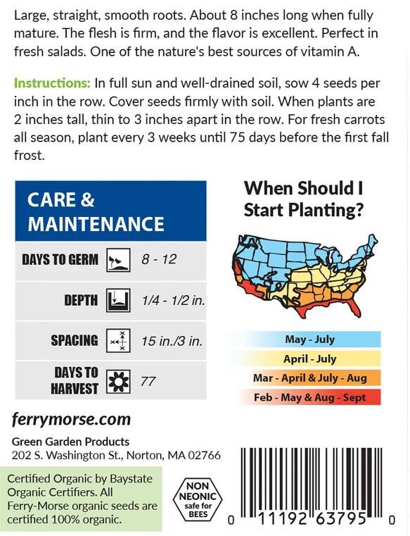 Long Imperator Carrot has large, straight, smooth roots that grow to about eight inches long when fully mature. It's perfect in fresh salads! Enjoy the crunchy texture and vibrant taste. Its vitamin A content is an excellent addition to any balanced diet.