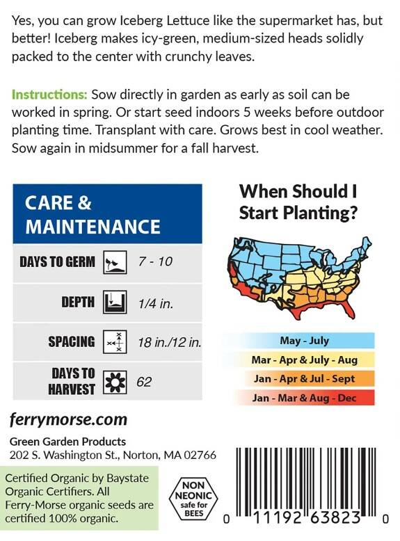 Our Organic Iceberg Lettuce seeds will bring you lettuce heads similar to the ones you buy in your supermarket. This lettuce variety grows icy-green, medium-sized heads that are packed solid to the center with crunchy leaves.