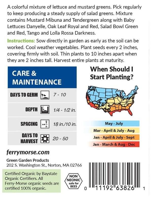 Grow a colorful mixture of lettuce and mustard greens with Organic Gourmet Greens Mixture Mesclun seeds. The leafy greens you'll grow from this unique blend of vegetable seeds are packed with vital nutrients and flavor, providing a nutritious boost to any meal.