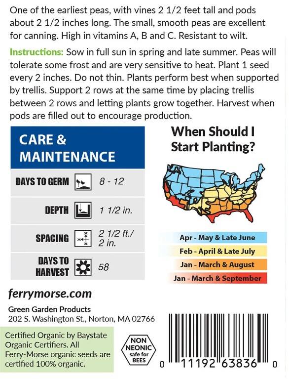 The Alaska Pea is one of the earliest pea varieties. This sturdy and nutritious pea variety is an easy and reliable choice for your home garden, providing vitamins A, B, and C and outstanding resistance to wilt.