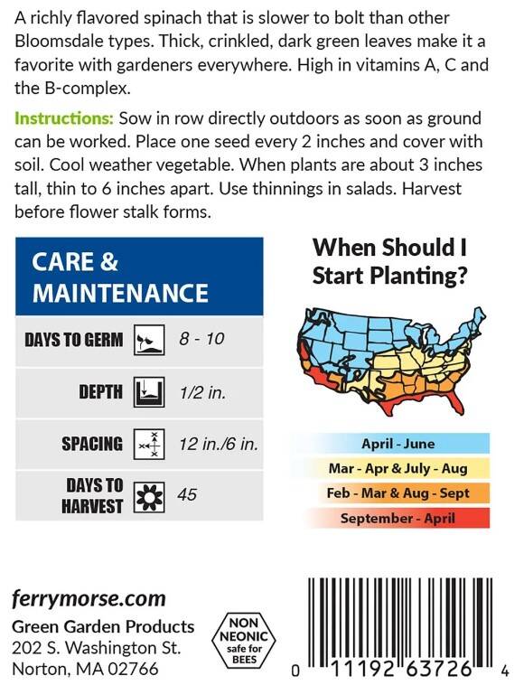 Bloomsdale Long Standing Spinach germination takes roughly eight to ten days and should reach maturity in forty-five days. This cool-weather vegetable is a favorite among gardeners everywhere!