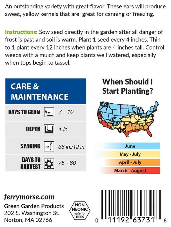 An outstanding sweet corn variety with great flavor! This hybrid variety is widely adapted, ensuring robust and flavorful crops wherever grown. Unmatched in taste, texture, and visual appeal, Early Golden Bantam has been a prized corn variety for generations.