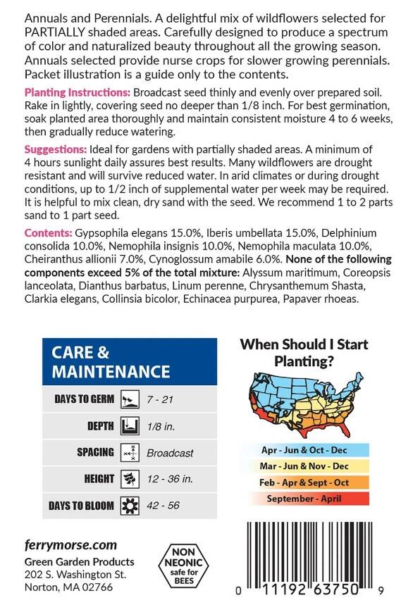As the name implies, we selected these wildflower seeds for partially shaded areas. This mix was carefully designed to produce a spectrum of color and naturalized beauty throughout the growing season. The annuals selected in this mix provide nurse crops for the slower-growing perennials. Packet illustration is a guide only to the contents.