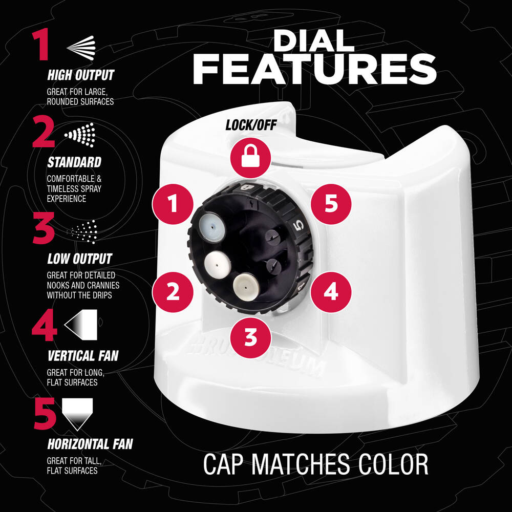 Rust-Oleum Stops Rust Protective Enamel with Custom Spray 5-in-1 lets you choose from five spray patterns with a twist of the dial. Use the high output spray for large curved surfaces, standard for a traditional experience, low output for details and corners without drips and runs, and vertical or horizontal fans for flat surfaces. Whether you’re painting wide spaces, tight corners or textured surfaces, Protective Enamel with Custom Spray 5-in-1 gives you ultimate control for superior results. When you're done, turn the dial to the lock position and store the remaining spray paint for your next project.