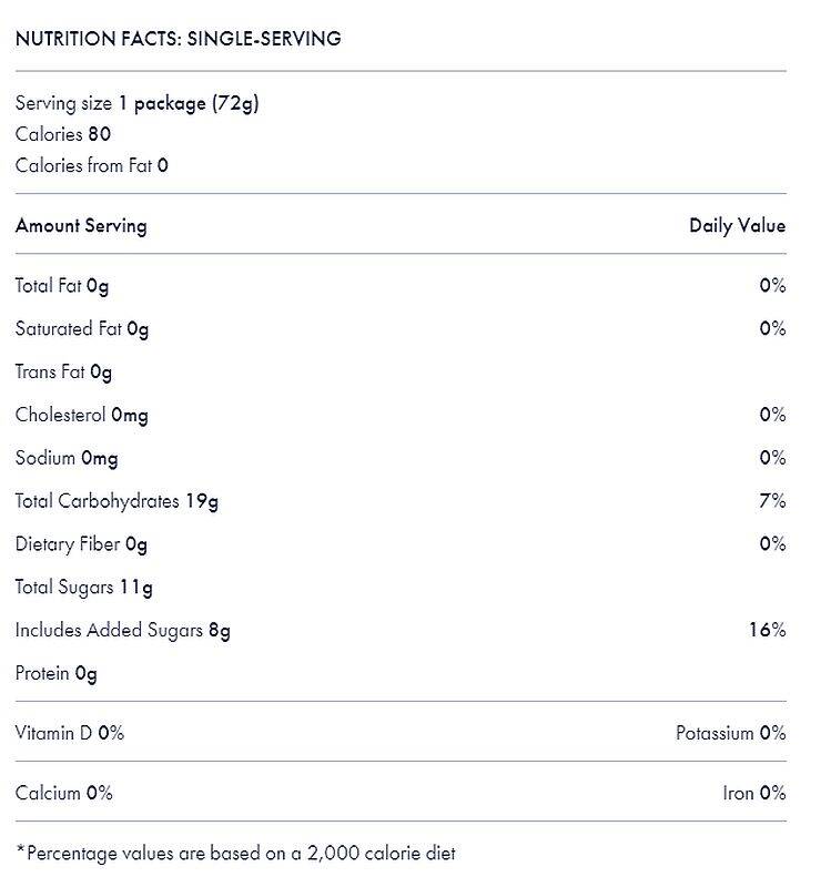 | Ingredients | Water, corn syrup, sugar, natural and artificial flavors, contains 2% or less of the following: FD&C Red #40, FD&C Blue#1, Caramel Color, citric acid, cellulose gum. |