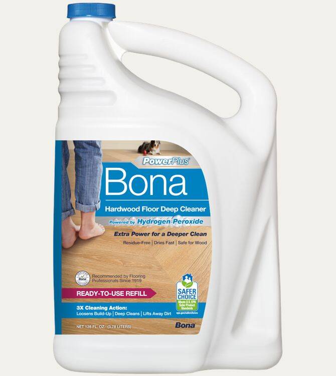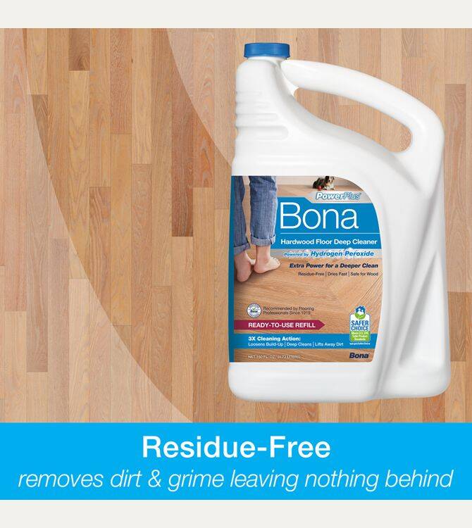 Bona PowerPlus Hardwood Floor Deep Cleaner Refill fills your empty Bona cartridge or spray bottle with ready-to-use Bona PowerPlus Hardwood Floor Deep Cleaner. The bottle has splashless technology while the handle and side grip allow for an easy, controllable refill experience. Bona PowerPlus Hardwood Floor Deep Cleaner has an oxygenated formula that loosens and removes heavy dirt build-up and stuck-on messes, providing a deep clean for your hardwood floors without the extra effort. Use Bona PowerPlus Hardwood Floor Deep Cleaner with the Bona PowerPlus Microfiber Deep Clean Pad for the ultimate cleaning performance.