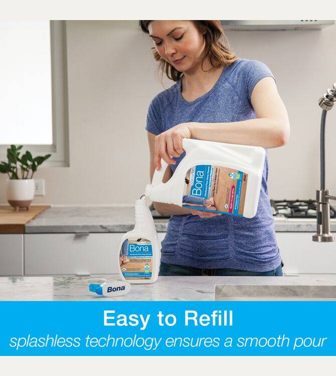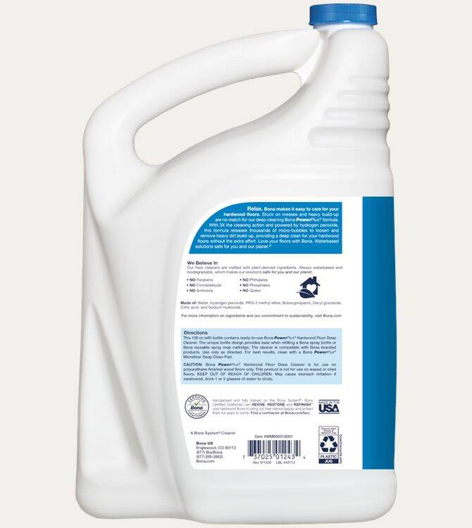 Bona PowerPlus Hardwood Floor Deep Cleaner Refill fills your empty Bona cartridge or spray bottle with ready-to-use Bona PowerPlus Hardwood Floor Deep Cleaner. The bottle has splashless technology while the handle and side grip allow for an easy, controllable refill experience. The oxygenated formula loosens and removes heavy dirt build-up and stuck-on messes, providing a deep clean for your hardwood floors without the extra effort. We believe in crafting our floor cleaners with plant-derived ingredients, and always using waterbased and biodegradable solutions making a safer product for people, pets, and the planet.