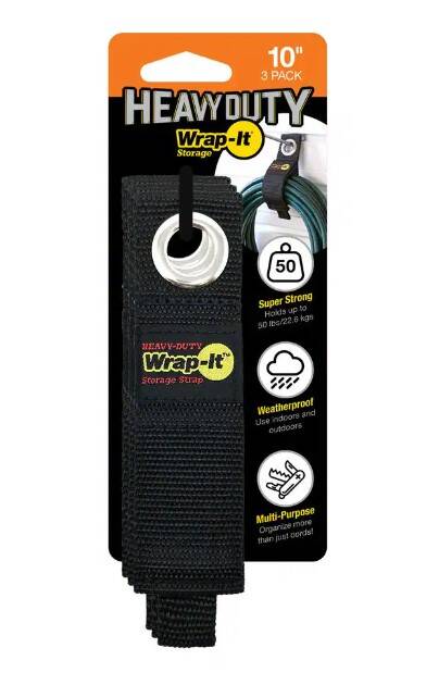 Heavy-Duty Wrap-It Storage Straps are tough. Made with heavy-duty polypropylene, industrial strength hook and loop, and a rust-resistant grommet these are built to last indoors or outdoors.