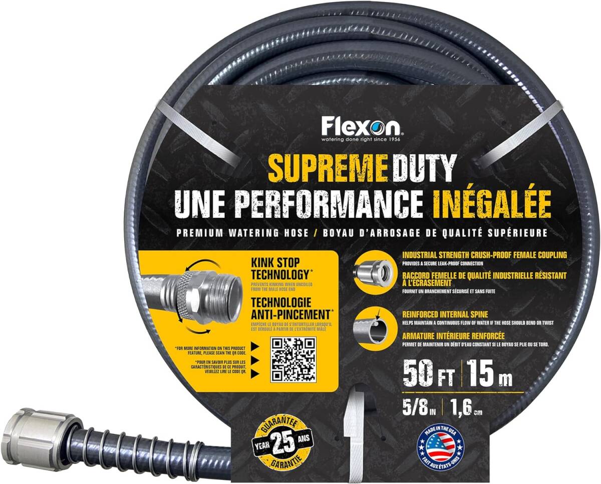 • Flexon Supreme Duty Hoses boast a high burst strength of 300 PSI, making this hose ideal for commercial use in landscaping, jobsites, and cold weather conditions.