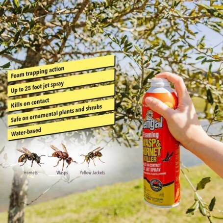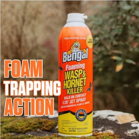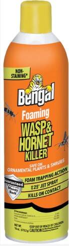 The water-based foam continues to kill insects returning to the nest for thorough extermination. Safe for use on most ornamental plants and shrubs, it won’t stain most home siding or asphalt shingles, depending on their condition and cleanliness. The formula contains 0.5% Permethrin, a powerful insecticide. For areas with electrical equipment, use Bengal Non-Conductive Wasp & Hornet Killer.