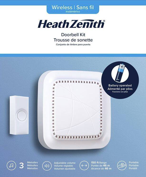 The Heath Zenith Wireless Plug-In Doorbell Kit includes 1 chime and 1 wireless push button. The Plug-in chime features a traditional Ding-Dong sound for the front entrance and a Ding for your back entrance.