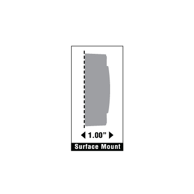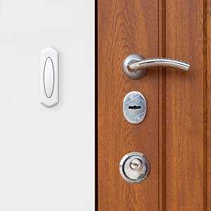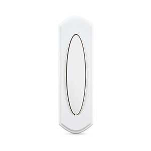 This white, plastic, wireless push button doorbell is battery operated and mounts with screws on the surface of a door frame or exterior wall.