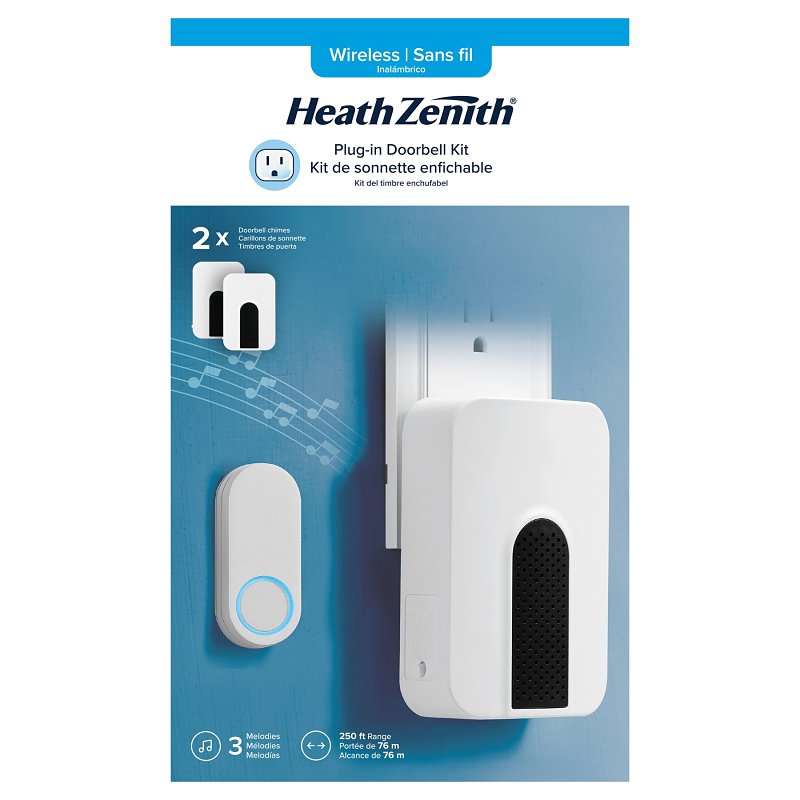 Heath Zenith White and Black Wireless Doorbell Kit includes two doorbell chimes, one doorbell button, two screws, and double sided tape.