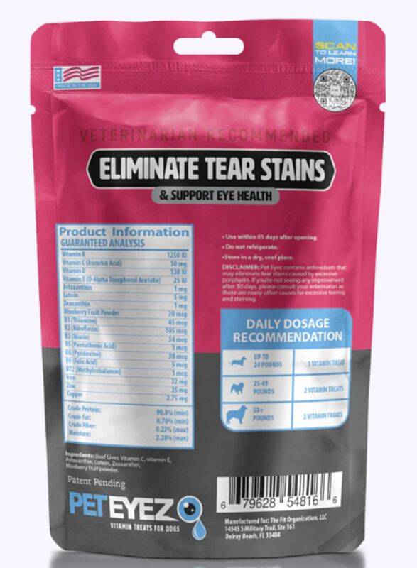Pet Eyez™ is a natural, tear stain remover that is designed to help stop the buildup of tear stains on your pet's face. Pets can suffer from eye diseases such as dry eye and corneal ulcers and may need to use Pet Eyez™ to get relief from these symptoms. Pet Eyez™ are made with antioxidants and natural ingredients that are safe for pets.