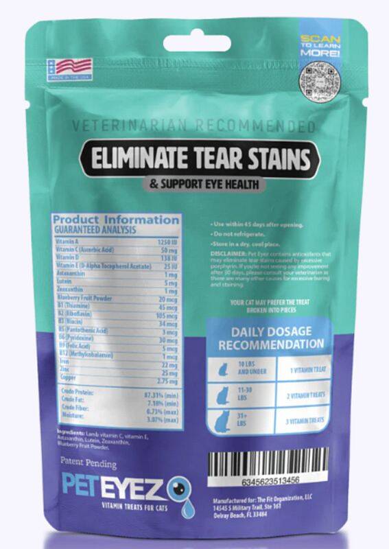 Pet Eyez™ is a natural, tear stain remover that is designed to help stop the buildup of tear stains on your pet's face. Pets can suffer from eye diseases such as dry eye and corneal ulcers and may need to use Pet Eyez™ to get relief from these symptoms. Pet Eyez™ are made with antioxidants and natural ingredients that are safe for pets.