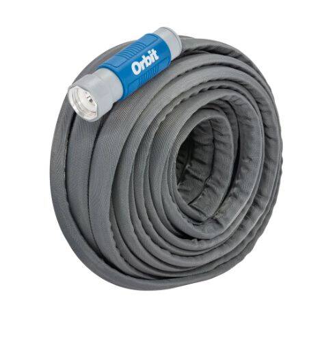 Get back to enjoying your watering tasks with the innovative Orbit Heavy-Duty Fabric Hose. This lightweight, professional-grade hose features AntiKink® technology to supply the best watering experience yet. The unique Exojacket® construction serves as an external barrier that will uphold its integrity throughout a lifetime of watering. These combined technologies supply a robust water flow providing 600 PSI burst strength. Wrench-free, crush-resistant anodized aluminum couplings with a heavy-duty, easy-to-grip collar at both ends makes installation a breeze. The Orbit Heavy-Duty Fabric Hose combines the most valued features in watering functionality to date. Lightweight yet sturdy, flexible, kink resistant, and portable; this hose is ideal for all your professional, garden, automotive, agricultural, and irrigation needs.