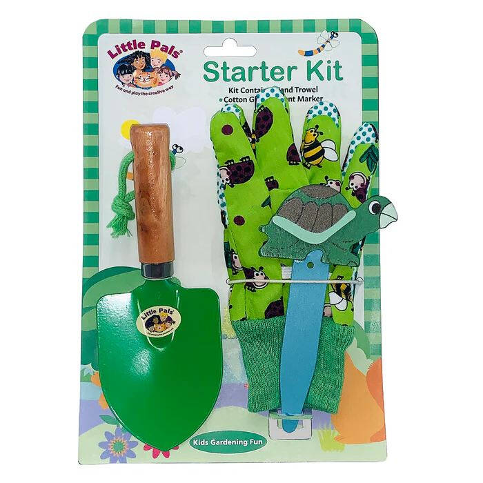 Let the gardening fun begin! Each kit contains a hand trowel, plant marker, and a pair of children's gloves for extra protection. The trowel has a metal head and a sturdy wooden handle. One size: ages 3 to 10. 10.75"Length x 7.25"Width x 1" Depth 0.5 Lbs.