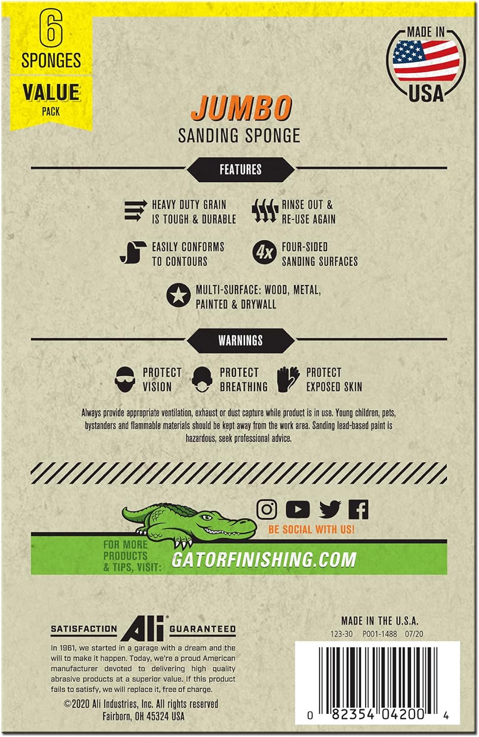 Gator® general purpose sanding sponges combine good performance with great value. Offered in two sizes, small area and jumbo, these four sided sponges are ideal when sanding and finishing wood, metal, drywall, fiberglass and painted surfaces. After use, these sponges can be rinsed and reused for the next project.