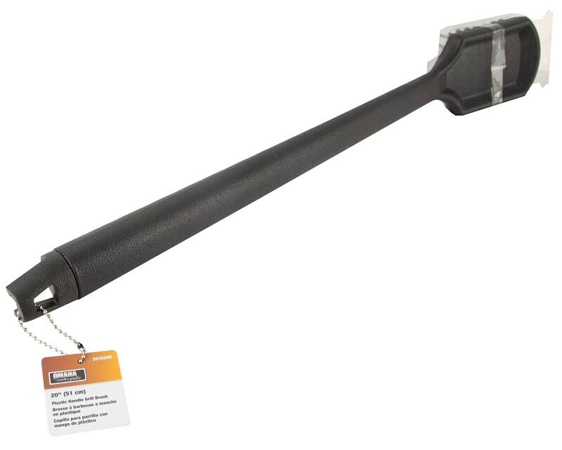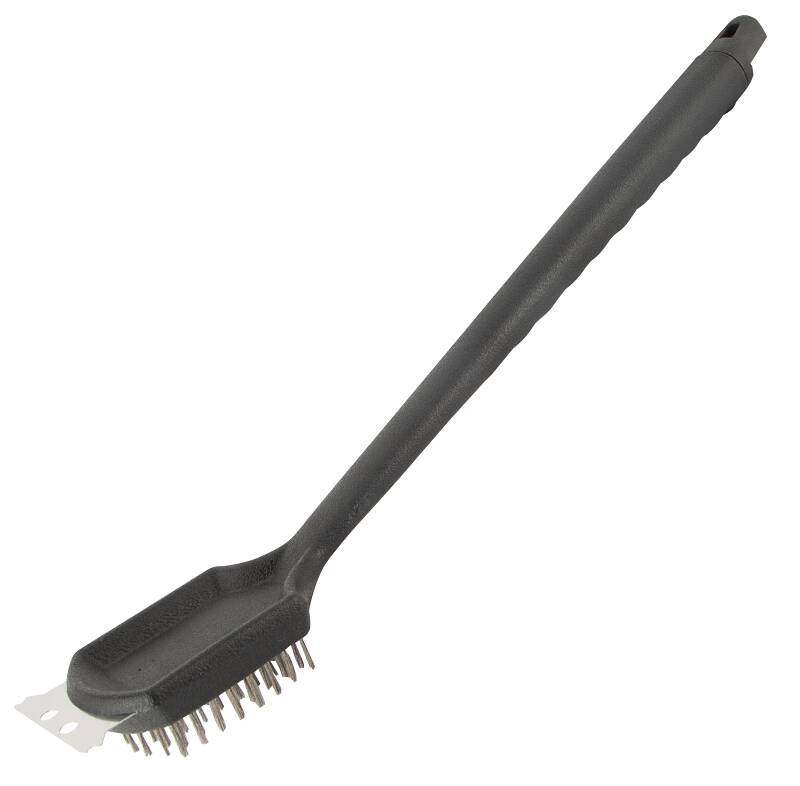 This Omaha grill brush has stainless steel bristles, and a stainless-steel scraper removes char and stuck on debris from grills.