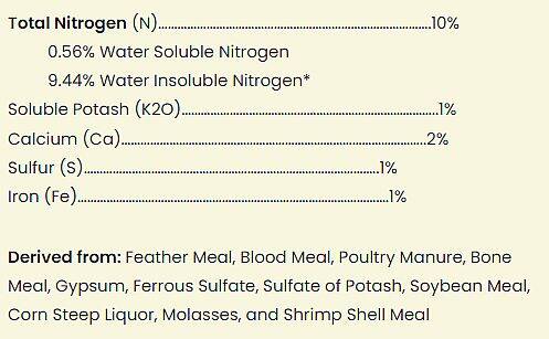 | Guaranteed Analysis | Total Nitrogen (N) 10%, 0.56% Water Soluble Nitrogen, 9.44% Water Insoluble Nitrogen*; Soluble Potash (K2O) 1%; Calcium (Ca) 2%; Sulfur (S) 1%; Iron (Fe)1% |