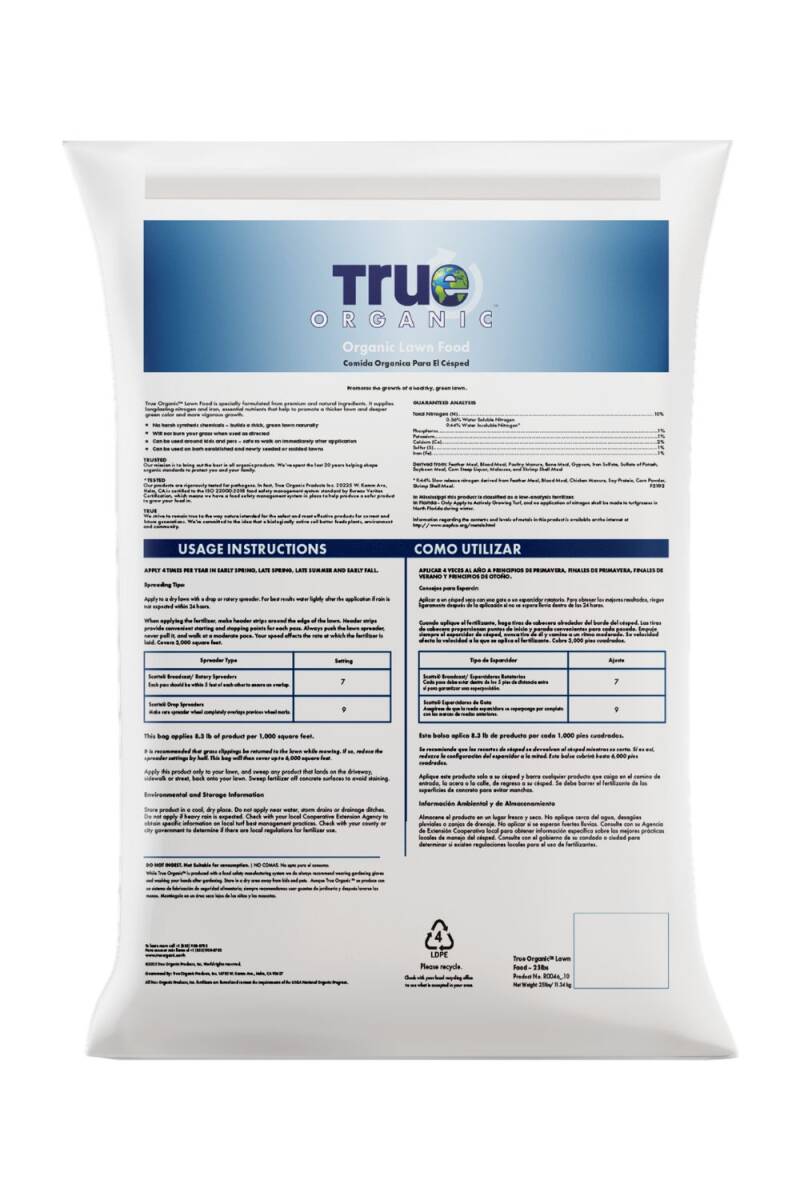 | Precautionary Statement | DO NOT INGEST. Not Suitable for consumption. While True Organicâ„¢ Lawn Food is produced with a food safety manufacturing system, we do always recommend wearing gardening gloves and washing your hands after gardening. Store in a dry area away from kids and pets. ENVIRONMENTAL AND STORAGE INFORMATION: Store product in a cool, dry place. Do not apply near water, storm drains or drainage ditches. Do not apply if heavy rain is expencted. Check with your local Cooperative Extension Agency to obtain specific information on local turf best management practices. Check with your county or city government to determine if there are local regualtions for fertilizer use. Apply this product only to your lawn, and sweep any product that lands on the driveway, sidewalk, or street, back onto your lawn. Sweep fertilizer off concrete surfaces to avoid staining. See package for additional warnings, instructions, and storage & disposal information prior to use. |