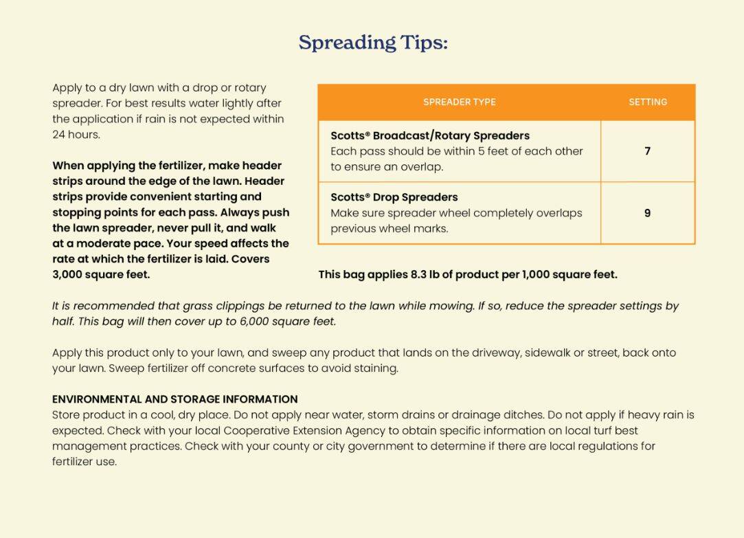 - It is recommended that grass clippings be returned to the lawn while mowing. If so, reduce the spreader settings by half. See instructions on packaging.