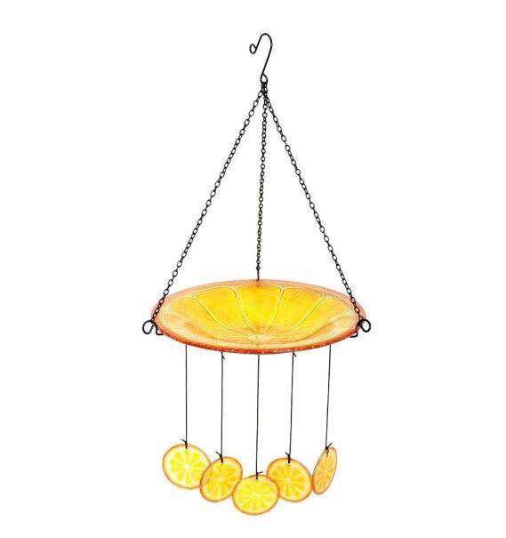 A fun, fresh design in this 27 inch long sunny orange combination chime and bird bath. Glass chimes catch the light while large glass bowls offers birds a place to dip and drink.