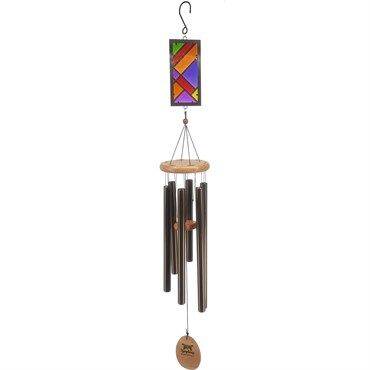 Elegantly styled 42 inch long windchimes add a flair to your garden with the new Stained Glass design. Bronzed chime tubes accompany the bursts of color created by the light shining through stained glass panel atop the chimes. Generous size and design will compliment both modern and rustic surroundings.