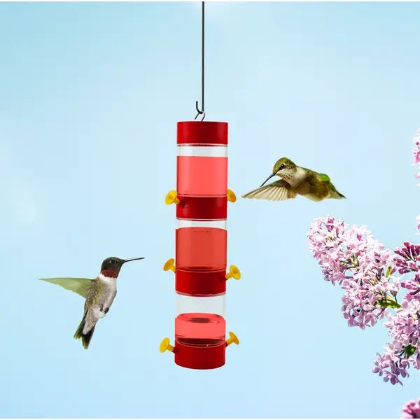 Clever modular design to attract the most hummingbirds! Stacking modular hanging hummingbird feeders create an endlessly high tower. Each plastic hummingbird feeder unit connects together and includes built-in ant moat. Holds 12 oz. of nectar with two bright yellow feeding ports. Fill your outdoor habitat with the flash of color and activity from feeding hummingbirds.