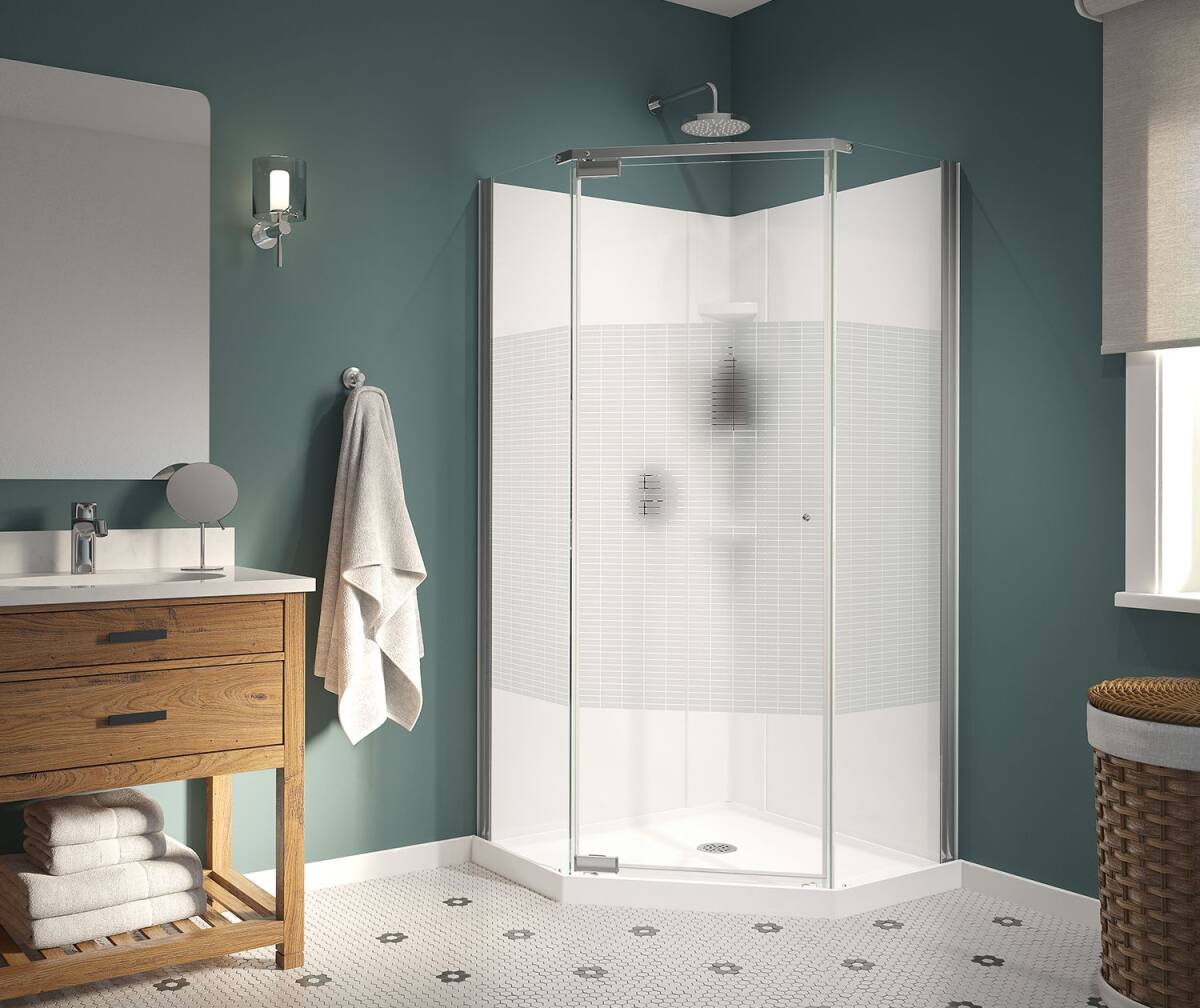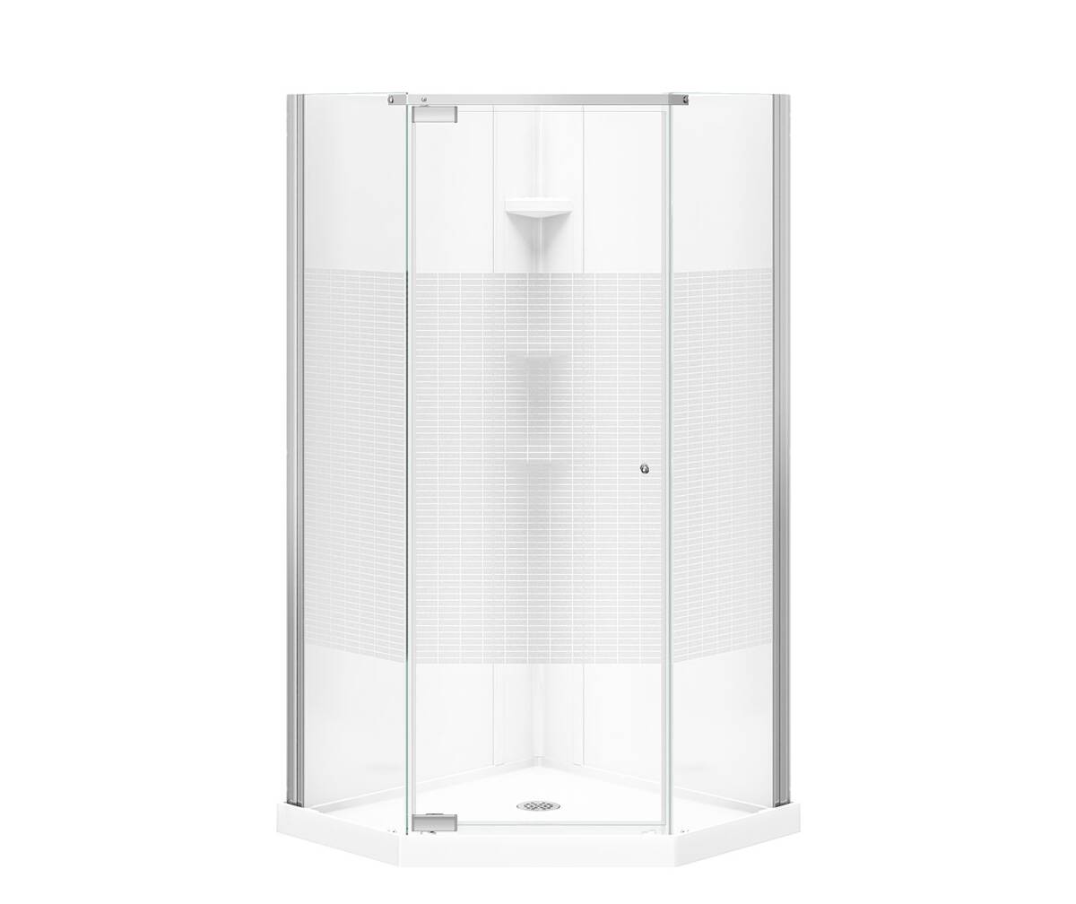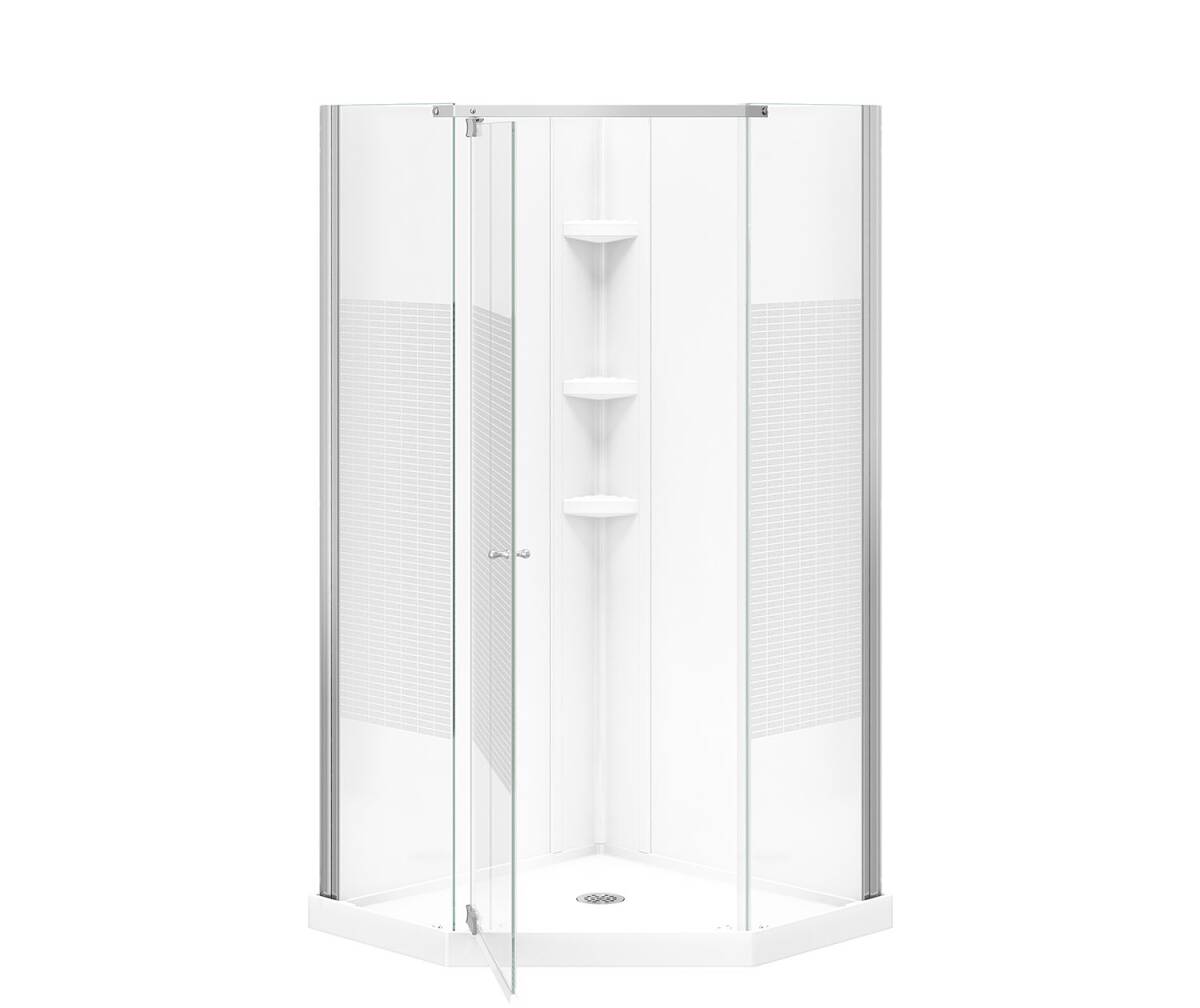 MAAX Begonia Carbon Polystyrene Center Drain Shower Kit In White With Carbon Glass In Chrome. Kit includes neo-angle shower base, door and walls.