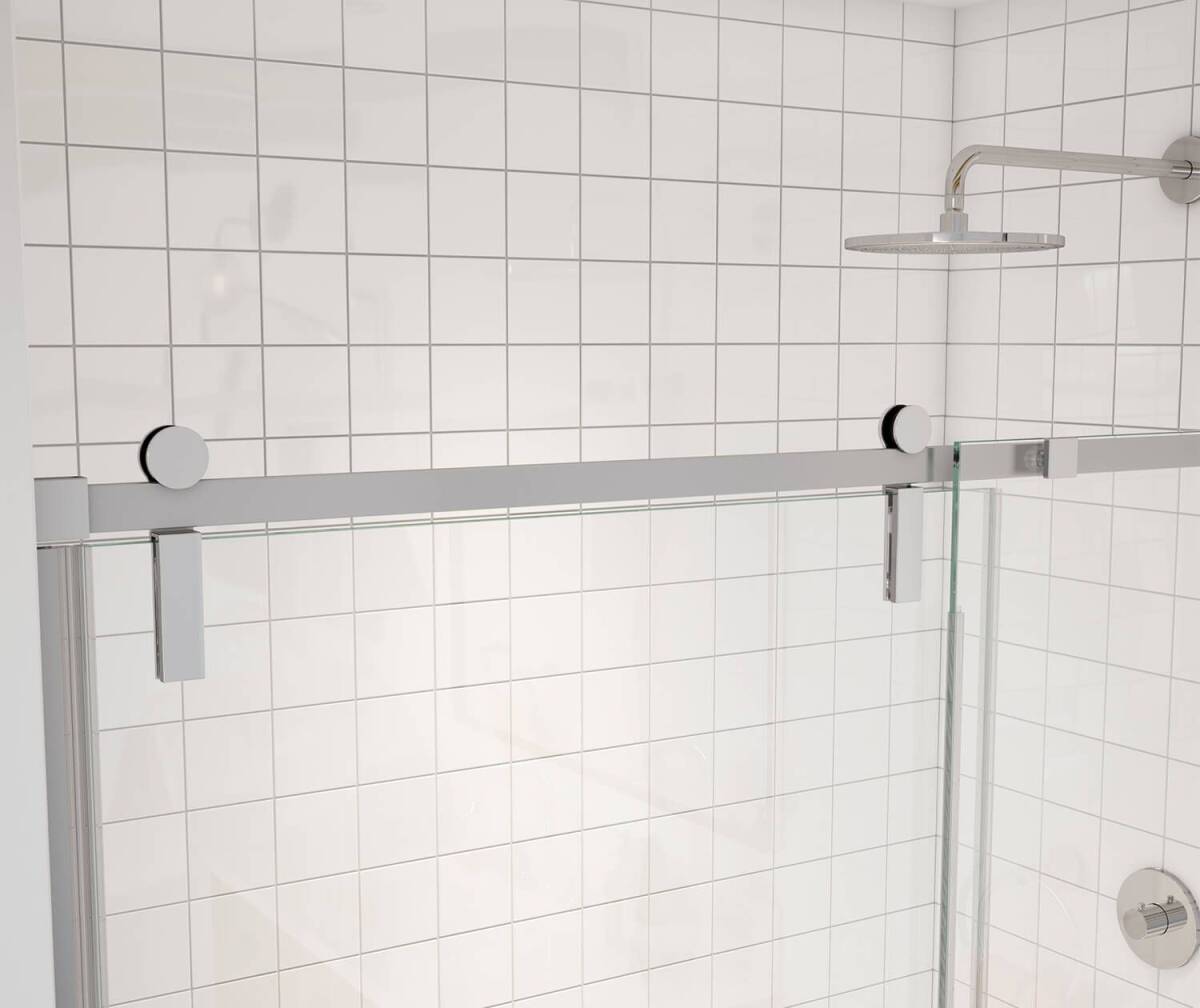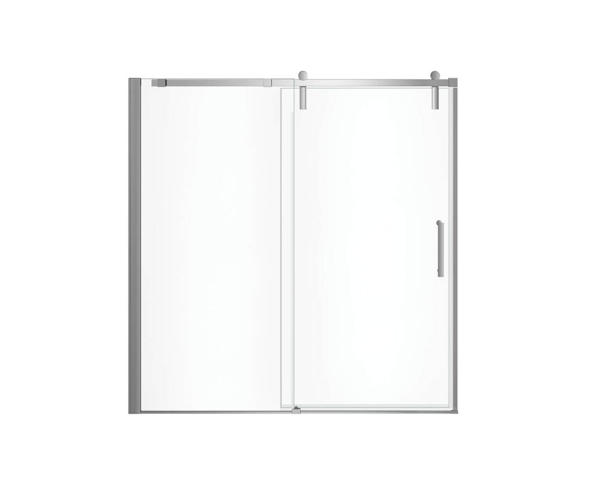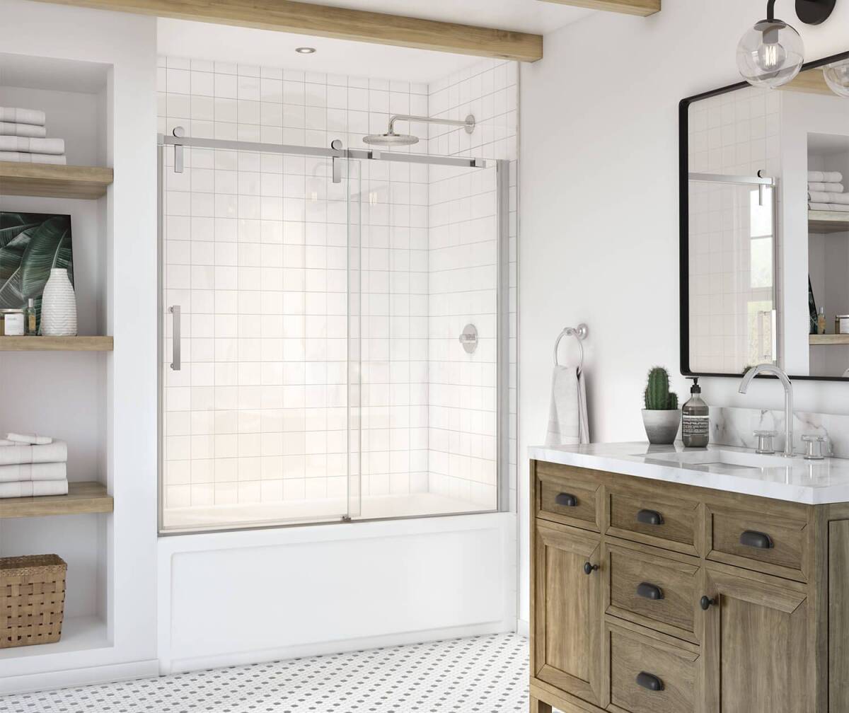 MAAX Outback brushed nickel sliding tub glass door for alcove installation. Featuring a unique contemporary barn door look with a minimalist design.