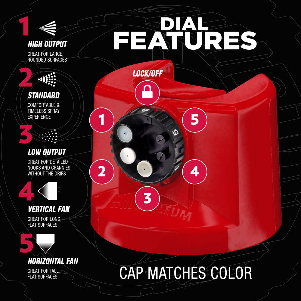 Rust-Oleum Stops Rust Protective Enamel with Custom Spray 5-in-1 lets you choose from five spray patterns with a twist of the dial. Use the high output spray for large curved surfaces, standard for a traditional experience, low output for details and corners without drips and runs, and vertical or horizontal fans for flat surfaces. Whether you’re painting wide spaces, tight corners or textured surfaces, Protective Enamel with Custom Spray 5-in-1 gives you ultimate control for superior results. When you're done, turn the dial to the lock position and store the remaining spray paint for your next project.
