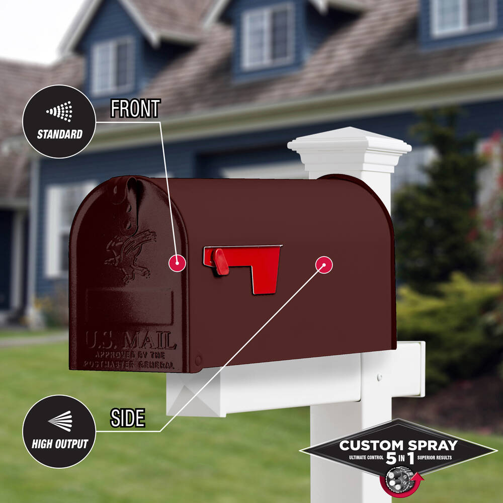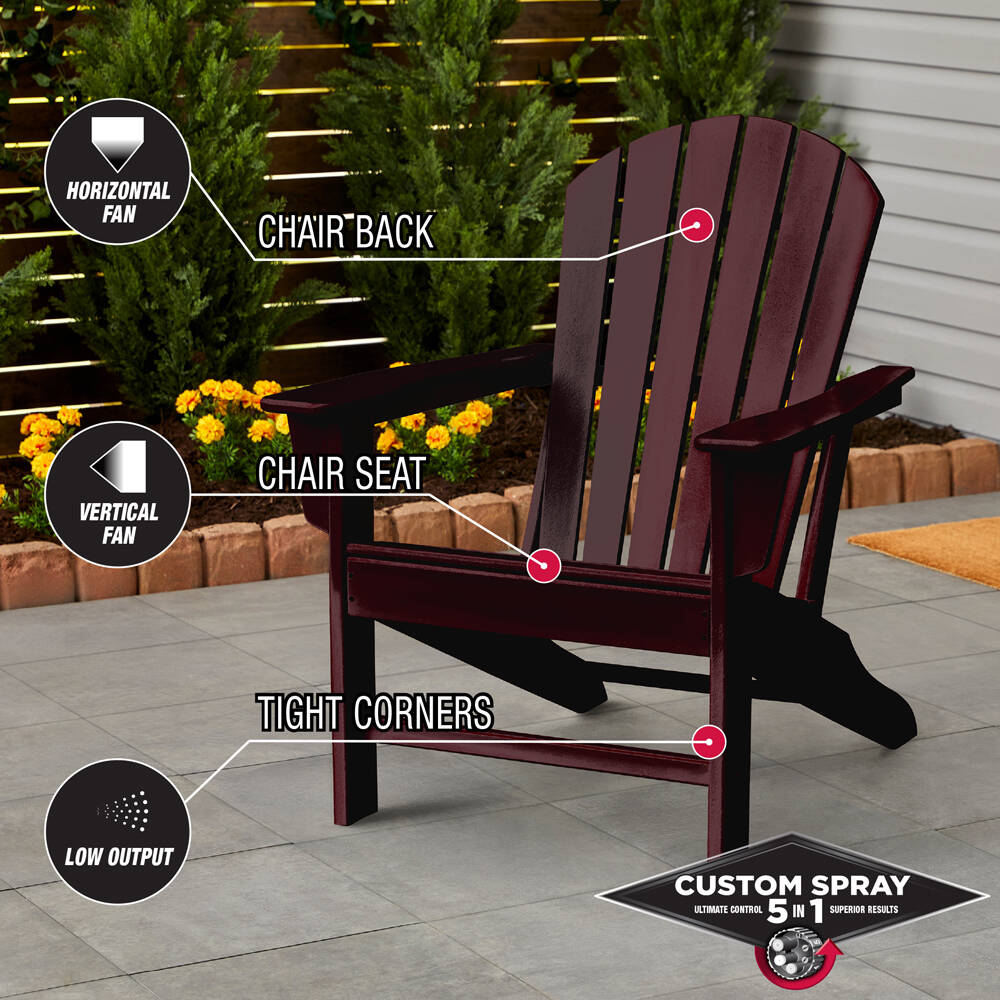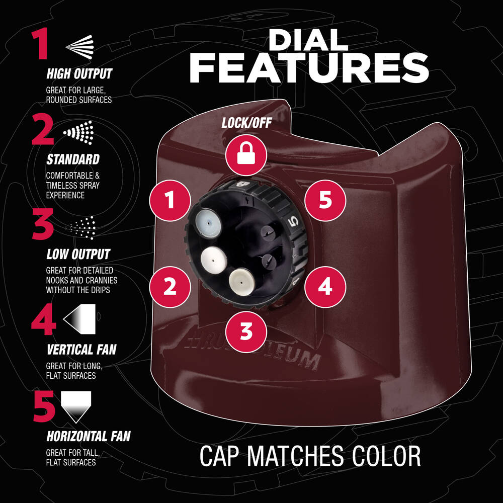 Rust-Oleum Stops Rust Protective Enamel with Custom Spray 5-in-1 lets you choose from five spray patterns with a twist of the dial. Use the high output spray for large curved surfaces, standard for a traditional experience, low output for details and corners without drips and runs, and vertical or horizontal fans for flat surfaces. Whether you’re painting wide spaces, tight corners or textured surfaces, Protective Enamel with Custom Spray 5-in-1 gives you ultimate control for superior results. When you're done, turn the dial to the lock position and store the remaining spray paint for your next project.