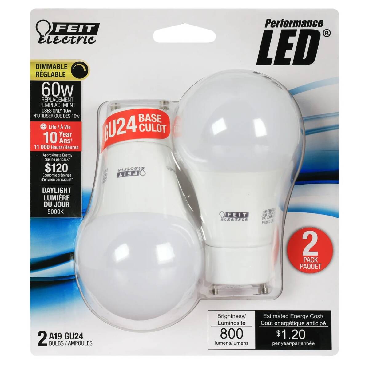 Enjoy all the benefits of advanced LED energy-saving technology with the Feit Electric 10-watt A19 LED Light Bulb. This 5000K Daylight White dimmable bulb replaces 60-watt incandescent bulbs. It produces a similar 800-lumen light output using only 10 watts of electricity, for up to 83% less energy than standard incandescents. Get instant-on to full brightness with relatively cool running performance. Feit Electric A60DM850GU2410KLED/2 bulbs have an average life of 11,000 hours/10 years, are RoHS compliant, and are 100% mercury free. Choose a dependable general-purpose bulb for residential or commercial applications.