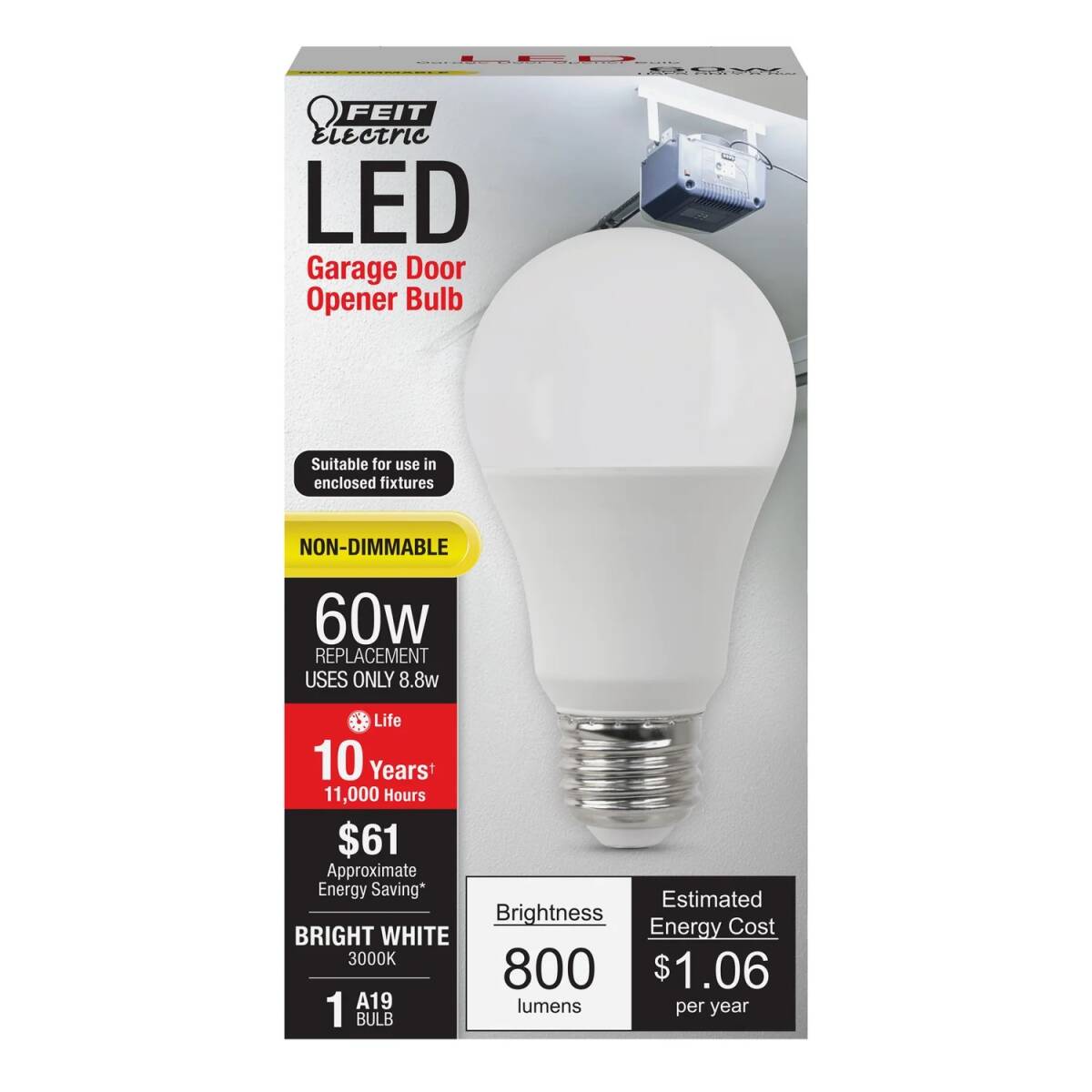The Feit Electric 60 W equivalent A19 shape LED bulb produces 800 Lumens of warm white light and is great for upgrading your garage lighting and all of your general-purpose household needs. Featuring a sleek, white design, this medium base LED replaces any general-purpose bulb in your home. It uses only 8.8 W of electricity - a savings of over 85% over a standard 60 W incandescent. Get instant ON to full brightness with relatively cool running performance. This affordable LED bulb makes it easy-to-transition your home to the latest energy-efficient technology.