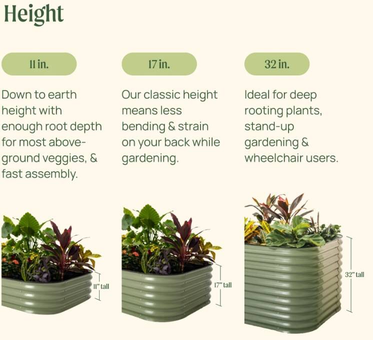 You do not need to bend down at all to garden in our 32" extra tall beds. In addition, 32" is tall enough to accommodate both large and small vegetables, allowing you to further customize your garden.