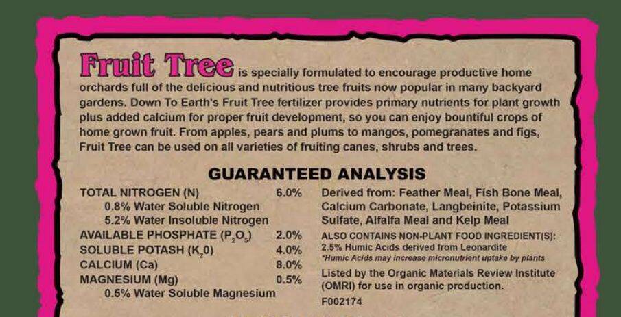 Down To Earth®’s Fruit Tree is designed for the delicious and nutritious tree fruits now popular in many backyard gardens. DTE® Fruit Tree fertilizer provides primary nutrients for plant growth plus added calcium for proper fruit development, so you can enjoy bountiful crops of home grown fruit. From apples, pears and plums to mangos, pomegranates and figs, Fruit Tree can be used on all varieties of fruiting canes, shrubs and trees.