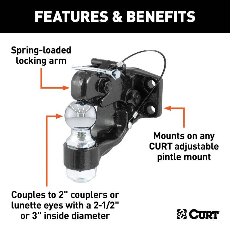 In agriculture, construction and even military applications, pintle hitches are the trusted product of specialized towing. They are notorious for their high weight capacity and simple design. The basic pintle hitch is essentially a hook and loop, with the hook attached to the vehicle and the loop mounted on the trailer. Because of their simple design, pintle hitches are able to have thicker metal construction and more secure coupling. Curt combination ball and pintle hitches combine both a pintle hook and a standard trailer ball to give you a more complete towing option on your heavy-duty truck or SUV. Combination ball and pintle mounts are available with a shank to mount on a receiver or in the adjustable style to mount on a channel or plate. This particular Curt combination pintle and ball mounts features a ball capacity of 10,000 lb and a pintle capacity of 16,000 lb. It fits any lunette ring with a 2-1/2 in inside eye diameter and features a changeable 2 in trailer ball with a hard chrome finish. A safety pin and bolt kit are also included in this package. The heavyweight towing done with pintle hitches implies a certain amount of wear and tear on your towing equipment and to prepare for this, Curt uses a quality finish on all our pintle mounts, lunette eyes and combination pintle hitches. This combination ball/pintle hook is coated in a black powder coat finish to provide the perfect amount of rust and scratch resistance needed to face the heavy-duty towing you do every day.
